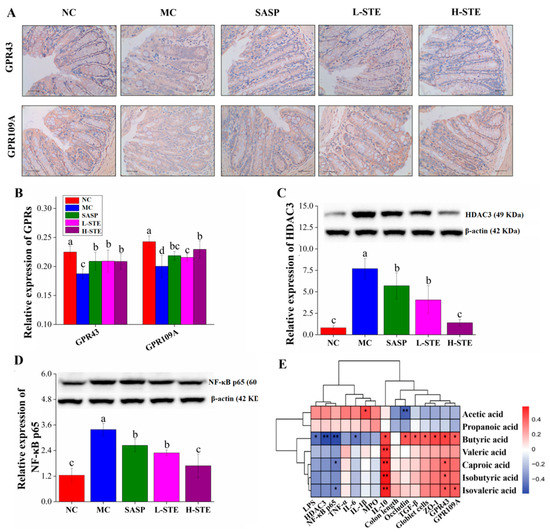 Effects of STE on the expression of GPRs, HDAC3, and NF-κB p65 in the colon of DSS-induced ulcerative colitis mice. (A) The immunohistochemistry analysis of GPR43 and GPR109A in the colon (magnification of 400×). (B) The expression of GPR43 and GPR109A in the colon. (C) The expression of HDAC3 protein in the colon. (D) The expression of NF-κB p65 protein in the colon. (E) Correlation between SCFAs and indicators of intestinal barrier and inflammatory indexes (* p < 0.05, and ** p < 0.01). Values are expressed as the mean ± the SD (n = 5). Bars with different lowercase letters indicate significant differences (p < 0.05).