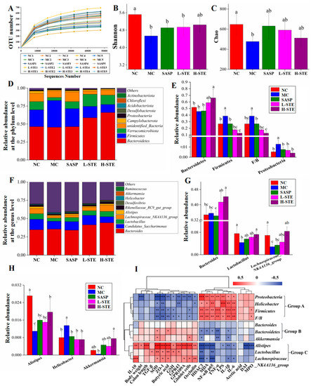 Studies increasingly indicate that gut microbiota play a critical role in the etiology of UC [1]. We, thus, next used 16S rRNA gene sequencing to investigate whether STE could regulate the gut microbiota in DSS-induced UC mice. A total of 3,918,991 original 16S rRNA reads were obtained from 25 fecal samples (n = 5 per group) and further divided into 504 distinct operational taxonomic units (OTUs). As depicted in Figure 6A, the sequencing depth of this study was sufficient based on the OTU curve, which tended to be flat. In addition, according to the alpha diversity analysis, DSS treatment obviously reduced the Shannon and Chao indexes in the MC group (vs. the NC group; p < 0.05), but STE or SASP intervention overall did not significantly alter the above changes (Figure 6B,C; p > 0.05). Moreover, taxonomic characteristics of each group at the phylum and genus levels were compared to evaluate specific changes in the intestinal flora. First, a total of 10 different phyla were detected, and Bacteroidetes and Firmicutes were found as the leading phyla, accounting for more than 73% of the total abundance in all groups (Figure 6D). In addition, the MC group showed significant increases in the relative abundance of Firmicutes (38.54% vs. 26.67%) and Proteobacteria (1.28% vs. 0.52%) and the Firmicutes/Bacteroidetes (F/B) ratio (0.39% vs. 0.27%) when compared with the NC group (Figure 6E; p < 0.05). However, H-STE treatment significantly blocked these changes and increased the relative abundance of Bacteroidetes by 44.91% (p < 0.05) compared to the MC group (Figure 6E). Furthermore, the taxonomic communities at the genus level are shown in Figure 6F. Compared with the MC group, H-STE intervention significantly increased the abundance of Lactobacillus (Figure 6G), Lachnospiraceae_NK4A136_group (Figure 6G), and Alistipes (Figure 6H) and also blocked the increased relative abundance of Helicobacter in DSS-induced UC mice (Figure 6H). In particular, compared with the NC group, the abundance of Bacteroides (Figure 6G) and Akkermansia (Figure 6H) did not significantly change in the MC group but significantly increased in the H-STE group (Figure 6; p < 0.05). These results suggest that STE could alter the intestinal microbiota of DSS-induced UC mice.