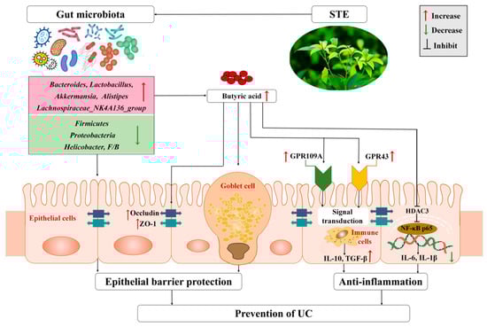 Taken together, we propose a possible mechanism of STE against UC based on the regulation of gut microbiota and their metabolites (Figure 7). Specifically, STE prevented gut microbiota dysbiosis by decreasing the abundance of Firmicutes, Proteobacteria, and Helicobacter and increasing the abundance of Bacteroidetes, Lactobacillus, Akkermansia, Lachnospiraceae_NK4A136_group, and Alistipes, accompanied by a significant increase in the content of butyric acid to protect intestinal barrier function, up-regulate the butyric acid–GPR signaling cascade, and inhibit the HDAC3/NF-κB inflammatory signaling pathway, which eventually blocked intestinal inflammation and oxidative stress injury of UC mice.