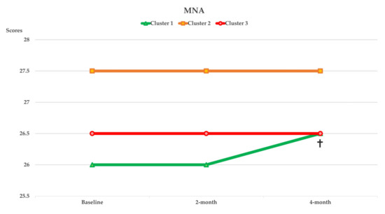 Curve chart for the within cluster comparison of median of intrinsic capacity in vitality captured by MNA, HGS, and TMS at two-month and four-month of intervention. *, ** Indicated significant different from baseline, compared by Wilcoxon Signed Rank test; *p < 0.05, **p < 0.01. † Indicated significant different trend from baseline, compared by Friedman test. HGS, handgrip strength; MNA, Mini Nutritional Assessment; TMS, two minutes steps.