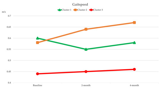 Curve chart for the within cluster comparison of median of intrinsic capacity in locomotion captured by GS and OFS at two-month and four-month of intervention. GS, gaitspeed; OFS, One foot standing test.