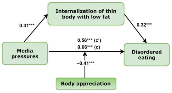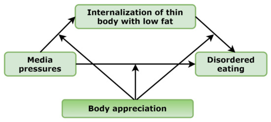 In the present study, we expected that body appreciation would moderate the associations between mediation models of girls and boys. In other words, we expected that associations between media pressures, internalization of thin and low body fat ideals, and disordered eating would be weaker in girls and boys expressing more positive body image and vice versa.