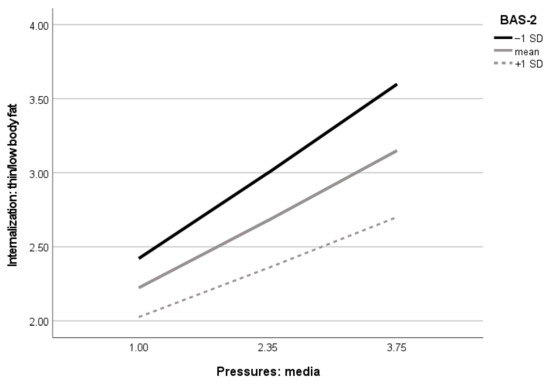 Visualization of body appreciation moderating effect in the association between media pressures and internalization of thin body with low fat in girls (n = 842). BAS-2 = Body Appreciation Scale-2, SD = standard deviation.