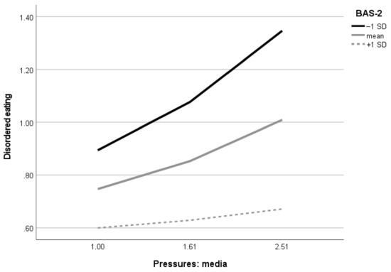 Visualization of body appreciation moderating effect in the association between perceived media pressures towards appearance and disordered eating in boys (n = 570). BAS-2 = Body Appreciation Scale-2, SD = standard deviation.