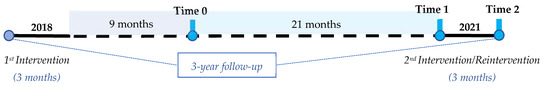 This was a prospective quasi-experimental study (ClinicalTrials.gov: NCT04571450). This research was approved by the Human Research Ethics Committee at the Hospital Universitario de Sagunto and followed the ethical guidelines established in the Declaration of Helsinki. The study describes the 3-year follow-up of 29 patients who already received an intervention with the ‘Living Better’ program in 2018 (n = 105) [17], as well as the result of completing the same program for a second time (reintervention) with the aim of helping to minimize the negative impact of the COVID-19 pandemic on lifestyle. To analyze the long-term effects of the program, we used the follow-up values obtained at the end of the first study as our starting point (Time 0) [17], which was carried out 9 months after this intervention. We also used the different variables analyzed in 2018 and recorded shortly before the start of the second intervention (Time 1), 21 months later than Time 0. Once this evaluation was completed, the participants started the 3-month online reintervention with the ‘Living Better’ program. Finally, in order to understand the impact of this second intervention on the health of the participants, all the variables were recorded again at the end of the program (Time 2) (Figure 1). Of note, all the patients were assessed within 3 days at the different study timepoints.