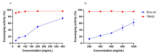 The free radical scavenging abilities of antioxidants can be assessed by DPPH, which is an organic compound composed of stable free radical molecules [16]. Here, TBHQ was used as a positive control to assess the antioxidant activity of emu oil. As shown in Figure 1a, the DPPH scavenging rate of emu oil increased with the increasing oil concentration, and the highest DPPH scavenging activity rate of 74.21 ± 3.12% was found at a concentration of 400 mg/mL. However, the DPPH scavenging rate of emu oil was lower than that of TBHQ solution at the same concentration.