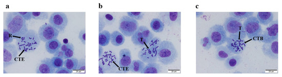 Types of chromosomal aberration for cell under microscope. (a). chromatid exchange (CTE) and ring (R); (b). chromatid exchange (CTE) and translocation (T); (c). chromatid break (CTB) and translocation (T).
