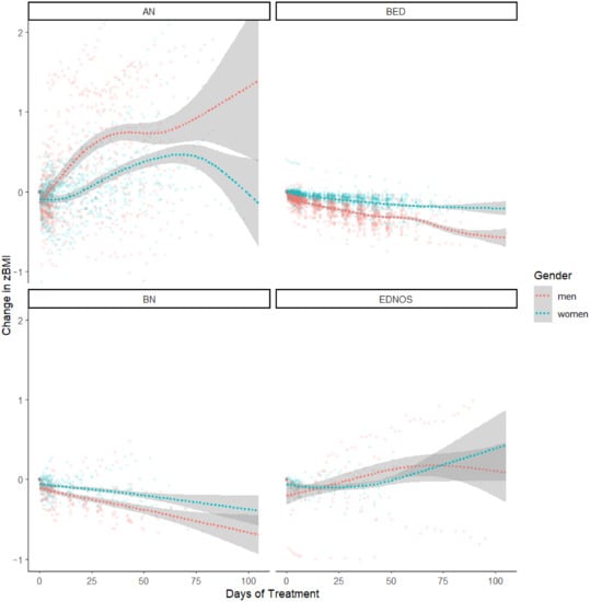 Patients’ weight trajectories, i.e., the time-dependent changes in age- and gender- standardized (zBMI) from admission to different timepoints during treatment (zBMItimepoint–zBMIadmission), as a function of gender, ED group, and treatment timepoint. Curved regression lines (with 95% confidence bands) were fitted using function geom_smooth(), method (“gam”), as implemented in R package ggplot2 v. 3.3.5 (R Core Team, Vienna, Austria) []. ED = Eating Disorder, AN = Anorexia Nervosa, BN = Bulimia Nervosa, BED = Binge Eating Disorder, EDNOS = Eating Disorder Not Otherwise Specified, BMI = body mass index.