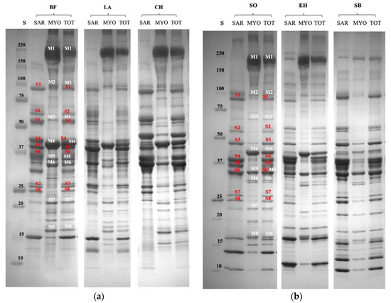 Gradient (8–18%) SDS-PAGE gel of myofibrillar (MYO), sarcoplasmic (SAR), and total (TOT) protein fractions extracted from beef (BF), lamb (LA), and chicken (CH) meat samples (a); and sole (SO), European hake (EH), and sea bass fish (SB) meat sources (b). M1 = myosin heavy chain; M2 = α-actinin; M3 = desmin; M4 = actin; M5 = troponin T; M6 = tropomyosin; M7 = myosin light chain 1; M8 = myosin light chain 2; S1 = glycogen phosphorylase b kinase; S2 = phosphoglucomutase; S3 = phosphoglucose isomerase; S4 = enolase; S5 = creatine kinase; S6 = glyceraldehyde phosphate dehydrogenase; S7 = phosphoglycerate mutase; S8 = triosephosphate isomerase.