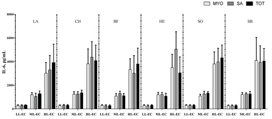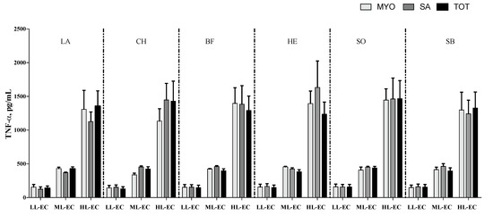 The cytokine pattern, in terms of TNF-α (Figure 2), IL-6 (Figure 3) and IL-10 (Figure 4), was not affected by different meat fractions and meat sources according to analysis of data within each class of cytokine response (LL-EC, ML-EC, and HL-EC).