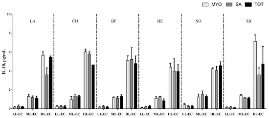 IL-10 secretion (means ± SE; pg/mL) in peripheral blood mononuclear cell supernatants of infants with generalized epilepsy treated in vitro with myofibrillar (MYO, light-grey bar), sarcoplasmic (SA, grey bar), and total protein (TOT, black bar) fractions from beef (BF), lamb (LA), chicken (CH), sole (SO), European hake (EH), and sea bass (SB) sources. LL-EC = group of children with epilepsy with similar levels of cytokines to those of control children; ML-EC = group of children with epilepsy with cytokine levels at least 2-fold higher (medium levels) than those of control children; HL-EC = group of children with epilepsy with cytokine levels at least 8-fold higher (high levels) than those of control children.
