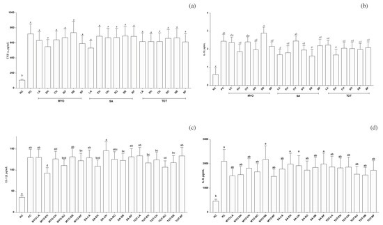 Cytokine pattern in terms of (a) TNF-α, (b) IL-10, (c) IL-1β, and (d) IL-6 (means ± SE; pg/mL) averaged among different classes (LL-EC = group of children with epilepsy with similar levels of cytokines to those of control children; ML-EC = group of children with epilepsy with cytokine levels at least 2-fold higher (medium levels) than those of control children; HL-EC = group of children with epilepsy with cytokine levels at least 8-fold higher (high levels) than those of control children) and based on in vitro treatments (NC = negative control, PC = positive control, SA-LA = sarcoplasmic protein fractions from lamb meat, MYO-LA = myofibrillar protein fraction from lamb meat, TOT-LA = total protein fractions from lamb meat, SA-CH = sarcoplasmic protein fractions from chicken meat, MYO-CH = myofibrillar protein fractions from chicken meat, TOT-CH = total protein fractions from chicken meat, SA-BF = sarcoplasmic protein fractions from beef, MYO-BF = myofibrillar protein fractions from beef, TOT-BF = total protein fractions from beef, SA-EH = sarcoplasmic protein fractions from European hake fish meat, MYO-EH = myofibrillar protein fractions from European hake fish meat, TOT-EH = total protein fractions from European hake fish meat, SA-SO = sarcoplasmic protein fractions from sole fish meat, MYO-SO = myofibrillar protein fractions from sole fish meat, TOT-SO = total protein fractions from sole fish meat, SA-SB = sarcoplasmic protein fractions from sea bass, MYO-SB = myofibrillar protein fractions from sea bass, and TOT-SB = total protein fractions from sea bass. a–d Means with different letters are significantly different, p < 0.05.