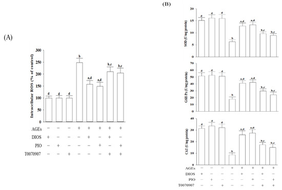 Effects on the level of ROS and the activities of antioxidant enzymes in AGE-cultured SH-SY5Y cells. Cells were pretreated with diosmetin (DIOS; 10 µmol/L) or pioglitazone (PIO; 5 μmol/L) for 1 h, then incubated with or without 200 μg/mL AGEs for another 24 h. T0070907 (5 μmol/L) was added 1 h before diosmetin or pioglitazone were stimulated. (A) The intracellular level of ROS was measured using the oxidation-sensitive fluoroprobe DCFH-DA. (B) Qualified commercial assay kits were used to determine the activities of SOD, GSH-Px, and CAT. The results are presented as the mean ± SD of five independent experiments (n = 5), each performed in triplicate. a p < 0.05 and b p < 0.01 compared to the data from untreated control group (control). c p < 0.05 and d p < 0.01 compared to the data from cells cultured under AGEs without any treatment.