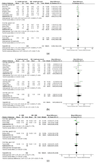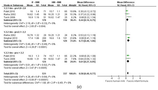 Forest plot of the effects of protein content of infant formula on the weight gain, height gain, and BMI of infants at 2 months of age. (a) The effects on weight gain. (b) The effects on height gain. (c) The effects on BMI.