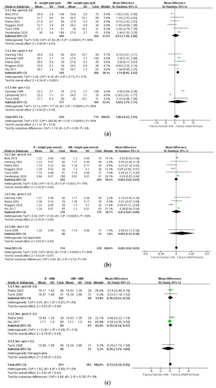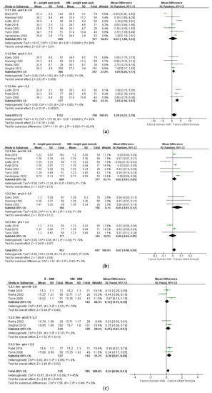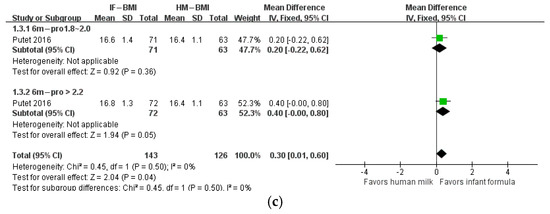 Forest plot of the effects of protein content of infant formula on the weight gain, height gain, and BMI of infants at 1 month of age. (a) The effects on weight gain. (b) The effects on height gain. (c) The effects on BMI.