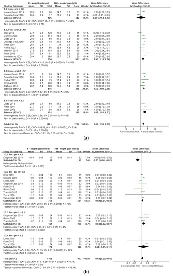 The means, standard deviations (SDs), and a number of samples about growth outcomes of infants during the first six months of life were extracted, which were weight gain, height gain, and BMI. Data were pooled according to age and protein content. We categorized the studied formulas into four groups according to their protein content: <1.8, 1.8–2.0, 2.1–2.2, and >2.2 g/100 kcal. The data were pooled using the meta-analysis approach. Forest plots were generated to compare the growth outcomes of infants fed exclusively with infant formula with different protein/energy ratios with those of infants fed exclusively with breast milk. In the studies that reported continuous variables as means, the mean difference (MD) between the experimental and control groups with 95% confidence intervals (CIs) was calculated. Heterogeneity was assessed using the I2 statistic defined by the Cochrane Handbook for Systematic Reviews. A fixed-effects model was used when there was no significant heterogeneity among studies; otherwise, a random-effects model was used. p values less than 0.05 were considered statistically significant. Microsoft Excel (Microsoft Corporation, Redmond, WA, USA), Review Manager v5.4 (The Cochrane Collaboration, London, UK), and R v4.1.2 were used for data extraction and analysis. Data extraction and analysis were performed independently by two investigators (Q.R. and K.L.). Discrepancies were discussed in the presence of W.Z. until consensuses were reached.