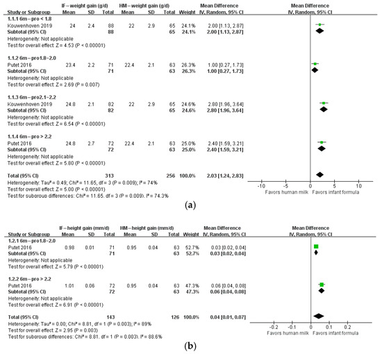 This review had some limitations. Because we separated protein contents into four levels and categorized the postnatal life into six stages, the number of studies in each category was limited. For example, at the age of under 1 month, there was only one study in each of the protein levels of <1.8, 1.8–2.0, 2.1–2.2, and >2.2 g/100 kcal. The limited number of studies diminished the power of the meta-analysis. Nevertheless, our results highlighted the dose-dependent effects of formula protein content on infant growth and the effects of formula feeding on growth in different postnatal ages, which could encourage future investigations by using animal models, human studies, and systematic reviews and meta-analysis. Additionally, we only analyzed the infants’ growth during first six months of the life, because nutrient intake during this time is provided only by breast or formula. Other sources of nutrition in the diet also play an important role after the introduction of complementary feeding. This review included studies of exclusive breastfeeding and exclusive formula feeding patterns, but mixed milk feeding (MMF) was not considered. MMF defined as the combination of breastfeeding and formula feeding during the same period in term infants [47]. There may be some changes in the growth performance of differently fed infants. Feng et al. conducted a longitudinal study of Chinese breastfeeding infant growth and development. It showed that infants who were nonexclusively breastfed had lower weights than those who were exclusively breastfed but that the difference was not statistically significant. However, there was an interaction between feeding patterns and age. The average weight of babies who were nonexclusively breastfed increased faster than those who were exclusively breastfed with age [48]. MMF is a widespread feeding reality. It is very important to evaluate MMF’s influence on infants’ nutritional status, growth, development, and health status in the short and long terms. Energy deposition as a percentage of total energy requirements decreases from 40% at age 1 month to 1–2% from 12 months until midadolescence. Therefore, weight gain during infancy is more closely related to energy intake than is weight gain in childhood or in later life [49]. Energy intake in early infancy is mainly from breast milk or formula, so breast milk or formula intake is closely related to weight gain during infancy. Eight of the twenty articles included in this systematic review reported infant formula intake (Supplementary Table S2). The results showed no difference between groups, except that the studies of Turck and Putet showed higher intakes of infants in the high-protein powder group [22,24]. Because of the limited evidence, it was unclear whether protein content affected infant formula intake. Studies have shown that breast milk or formula intake is associated with infant appetite traits. Appetitive traits are thought to be largely innate and stable. Infant appetitive profiles characterized by high food responsiveness and low satiety responsiveness are prospectively associated with more rapid weight gain. However, parental attitudes to following healthy infant feeding guidelines attenuate the effects of infant appetitive traits on infant milk intake and body weight [11].