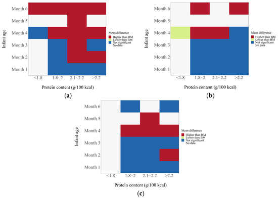 Heat map of the effects of protein content of infant formulas on the growth of infants. (a) The effects on weight gain. (b) The effects on height gain. (c) The effects on BMI.