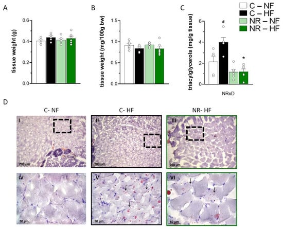 Early-life nicotinamide riboside (NR) treatment protected against high-fat (HF) diet-induced triacylglycerol accumulation in skeletal muscle in adulthood. Newborn male mice received NR or vehicle (water; control) from day 2 to 20 of age, were weaned onto a chow diet on day 21, and were assigned to either an HF or a normal-fat (NF) diet on day 90 for 10 weeks. Gastrocnemius muscle weight (A), weight as a percentage of body weight (B), and triacylglycerol content (C) at the end of the experiment. Data are the mean ± SEM of 5–6 animals per group. Circles correspond to individual data. Statistics (p < 0.05): NRxD treatment per diet interaction (two-way ANOVA); * NR vs. control, # HF vs. NF (t-Student). In (D), representative Oil Red O staining of Gastrocnemius muscle sections of indicated experimental groups are shown (panels I-III), together with corresponding magnification of indicated areas in boxes (panels IV-VI). Arrows in images denote intramyocellular neutral lipid droplets.