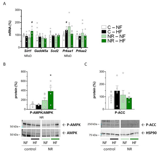 SIRT1 is a key mediator of the NR effects on energy metabolism [5], and SIRT1 and AMPK can positively feedback each other’s activity to activate FAO and mitochondrial biogenesis [44,45]. Interestingly, HFD feeding led to increased muscle Sirt1 mRNA levels selectively in the NR mice (Figure 3A), who also had a greater phospho-AMPK to AMPK ratio in muscle than control mice, especially following HFD feeding (Figure 3B). Additionally, muscle mRNA levels of Prkaa1, encoding one of two known AMPK catalytic subunit isoforms, were up-regulated in the NR mice compared with controls under NFD (p = 0.053, t-Student), albeit they were increased upon HFD in the control mice only (Figure 3A). These results are compatible with a relative up-regulation of the SIRT1/AMPK axis in SM of adult NR mice. However, known downstream transcriptional SIRT1 responses [46], namely Gadd45a and Sod2 expression, were not affected by the early-life NR treatment or the fat content of the diet (Figure 3A), and the same was true for the levels in muscle of the AMPK product phospho-ACC (Figure 3C).
