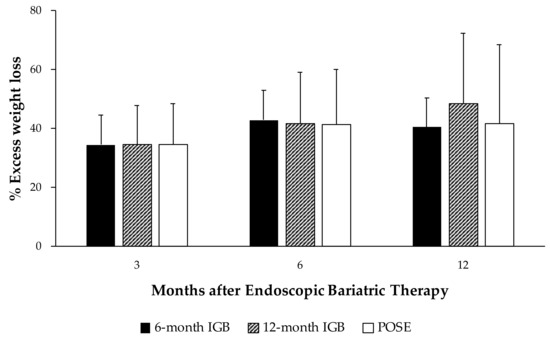 - Nunes, G.C.; Pajecki, D.; De Melo, M.E.; Mancini, M.C.; De Cleva, R.; Santo, M.A. Assessment of Weight Loss With the Intragastric Balloon in Patients With Different Degrees of Obesity. Surg. Laparosc. Endosc. Percutan. Tech. 2017, 27, e83–e86. [Google Scholar] [CrossRef]