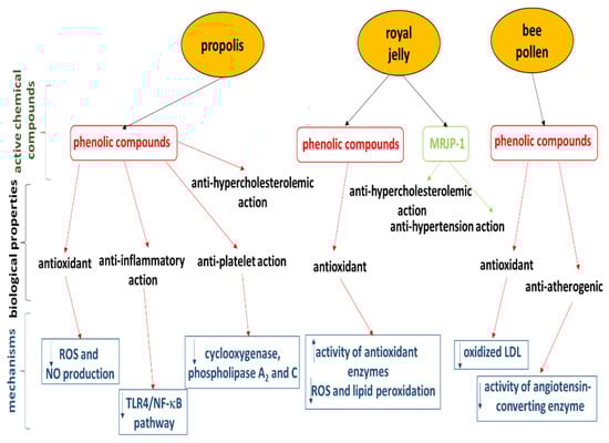 Olas, B. Bee Products as Interesting Natural Agents for the Prevention and Treatment of Common Cardiovascular Diseases. Nutrients 2022, 14, 2267. https://doi.org/10.3390/nu14112267