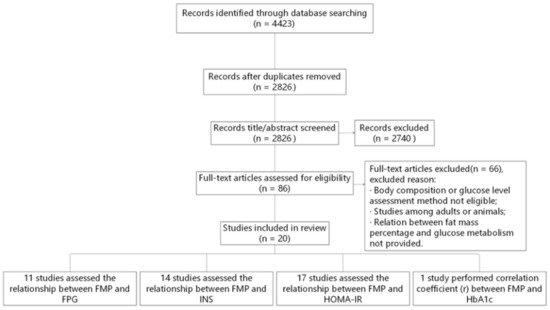 The original search identified 4423 studies. After removal of duplicates and elimination of papers based on eligibility criteria, 20 studies remained (Figure 1). Of the 20 studies included, 11 studies assessed the relationship between FMP and FPG, 14 studies assessed it between FMP and INS, 17 studies focused on the relationship between FMP and HOMA-IR, and 1 study calculated the correlation coefficient (r) between FMP and HbA1c.