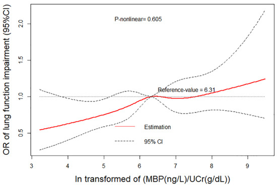 We have performed a dose–response analysis of the relationship between ln(MBP/UCr) and lung function impairment. It was observed that the higher concentration of MBP in urine was consistent with higher risk of all of lung function impairment (Figure 2). However, the p-value for the nonlinear dose–response manner was insignificant (Pnonlinear = 0.605).