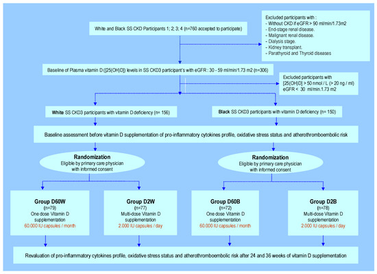 In this study, we have tested the supplementation dose–response of 25-hydroyxvitamin D (Cholecalciferol) in continuous low multi-doses (2000 IU/day) versus an intermittent high dose (60,000 IU/month), and to determine the optimal supplementation period (24 weeks versus 36 weeks) in CKD 3 adults’ Black versus White vitamin D deficiency participants from the same region of south-eastern Algeria. According to the pleiotropic Vitamin D3 effects, the objective of this investigation is to know whether the Vitamin D3 supplementation could modulate the following targets: (i) change of serum Vitamin D3 levels; (ii) attenuate pro-inflammatory cytokines production (iii); delete the oxidative stress damage; (iv) and avoid atherogenicity risk. To our knowledge, this study is the first investigation on the according racial/ethnic disparities in the Algerian Saharan population.
