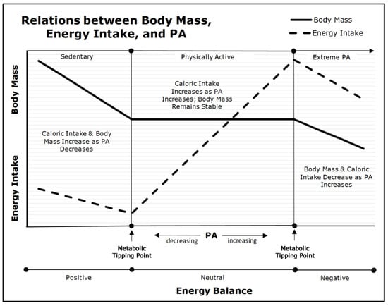 There is a large body of observational and experimental research dating from the 1950s showing that although body mass and composition and concomitant basal energy expenditure are the major determinants of caloric consumption [60,61,62,63,64], PA is the major modifiable determinant of consumption, expenditure, and storage [16,27,28,31,34,35,36,37,65,66,67,68]. Thus, because PA plays an essential role in all aspects of metabolism, we previously coined the term ‘Metabolic Tipping-point’ to denote the amount of PA necessary to prevent overconsumption and weight gain [1,12]. As briefly explained below, and in detail elsewhere [1,12], this concept offers a concise framework for understanding the heterogeneity of response of caloric consumption and body and fat mass to altered levels of PA.