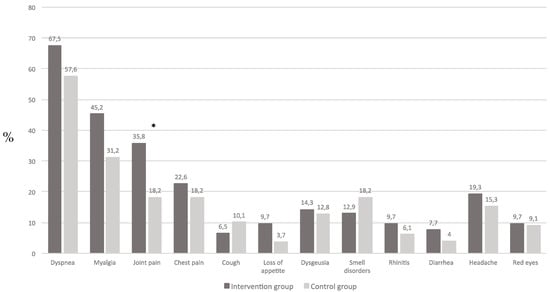 In addition to fatigue, other COVID-19 related persistent symptoms were present without significant differences (Figure 1). Persistent joint pain was the only symptom more frequently observed among subjects in the intervention group compared to those in the control group (36% versus 18%, respectively; p = 0.01).