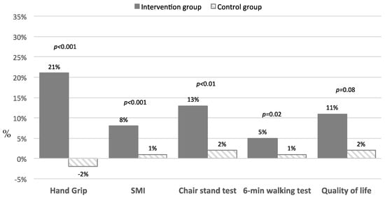 Percentage changes in skeletal muscle index, physical performance measures, and quality of life between baseline and follow-up.