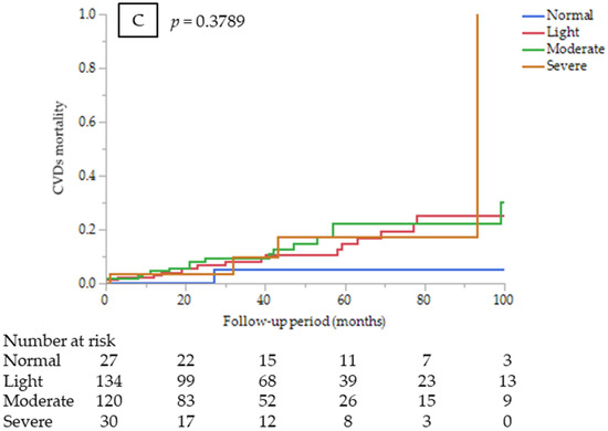 CONUT score (as a continuous variable) was an independent predictor of infectious disease mortality after adjustment for other confounders (HR 1.28, 95% CI 1.11–1.47, p = 0.0006). Kaplan–Meier mortality rates for infectious diseases for 7 years were 0%, 12.0%, 31.2%, and 34.7% in the normal, light, moderate, and severe CONUT groups, respectively (Figure 1B). However, estimating HR for infectious disease mortality between the CONUT score groups was not appropriate because no infectious death occurred in the normal group. On the other hand, the CONUT score was not a significant predictor of CVD mortality (HR 1.05, 95% CI 0.92–1.2, p = 0.4388). Kaplan–Meier mortality rates for CVDs for 7 years were 5.3%, 25.2%, 22.5%, and 17.3% in the normal, light, moderate, and severe CONUT groups, respectively (Figure 1C). There were no significant differences in CVD mortality risk among the CONUT score groups (p = 0.75).