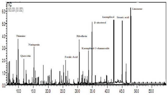 A total of fifty compounds were identified, representing 94.96% of the total identified compounds (Figure 1). About 32.36% of these compounds were identified as flavonoids and phenolics (Table 1) whereas 63.9% were identified as terpenes, organic acids, and others (Table 2). The most dominant compounds in the Ephedra foeminea extract reported here were limonene (6.3%), kaempferol (6.2%), stearic acid (5.9%), β-sitosterol (5.5%), thiamine (4.1%), riboflavin (3.1%), naringenin (2.8%), kaempferol-3-rhamnoside (2.3%), quercetin (2.2%), and ferulic acid (2.0%).