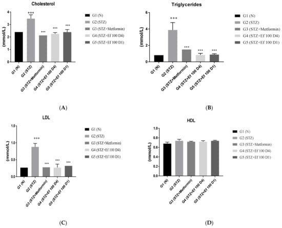 Effects of different treatments on serum lipid profiles in different groups. On Day 30, the concentrations of cholesterol (A), triglycerides (B), LDL (C), and HDL (D) were measured in all groups. Bars represent the mean of the parameters ± SD of 6 rats. Cholesterol, triglycerides, and LDL concentrations were significantly (*** p < 0.0001) lower in induced diabetic rats treated with metformin (G3) and Ephedra foeminea extract (G4 and G5) compared to the untreated induced diabetic rats (G2). The results are expressed as means ± SD (n = 3–4 dependent replicates), ***: p < 0.001 compared to G2: diabetic rats. +++: p < 0.001 compared G1: nondiabetic rats. The result were analyzed using one way ANOVA.