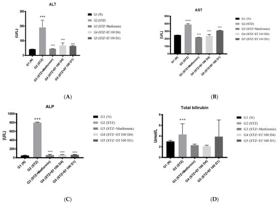 Liver enzymes (ALT, AST, ALKP), total bilirubin, and total protein levels in the rats’ serum samples were determined to evaluate the functions of the liver. As shown in Figure 5, untreated induced diabetic rats (G2) showed a significant increase in the concentrations of ALT, AST, ALKP, total bilirubin, and total protein compared to the normal group (p < 0.05), indicating hepatocellular damage associated with diabetes [24,25]. There was a significant decrease in the liver biomarker concentrations in the induced diabetic rats treated with metformin (G3) and Ephedra foeminea extract (G4) compared to the untreated induced diabetic rats (G2). Notably, the short-term treatment of induced diabetic rats with Ephedra foeminea extract (G5) was significantly higher than that of long-term treatment with Ephedra foeminea extract (G4).