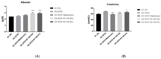 The kidneys eliminate waste from the body, thereby maintaining the ideal concentrations of urea, uric acid, creatinine, and ions. However, these metabolites accumulate in the bloodstream during renal diseases or renal damage that is commonly caused by chronic hypertension and diabetes [26]. The levels of these kidney parameters have been determined to assess the kidney’s functions. As shown in Figure 6, untreated induced diabetic rats (G2) showed a significant increase in the concentrations of creatinine, urea, phosphorus, chloride, and sodium ions compared to the normal group (p < 0.05), indicating renal damage. There was a significant decrease in these kidney marker concentrations in the induced diabetic rats treated with metformin (G3) and Ephedra foeminea extract (G4) with long-term treatment, indicating that the extract of Ephedra foeminea may elevate kidney damage and function. This elevation in kidney function markers in induced diabetic rats treated with Ephedra foeminea extract (G5) appears to be lower than that in induced diabetic rats treated with Ephedra foeminea extract (G4).