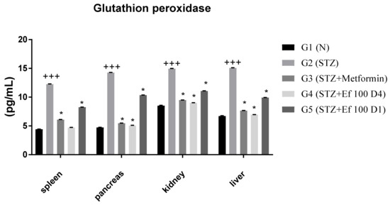 Concentrations of glutathione peroxidase in the spleen, pancreas, kidney, and liver of the experimental groups. Bars represent the mean of the glutathione peroxidase concentration ± SD of 6 rats. On Day 30, the animals were anesthetized and their organs, including liver, spleen, pancreas, and kidney, were collected and the concentrations of glutathione peroxidase in these organs were measured. The glutathione peroxidase concentrations were significantly (p < 0.05) decreased in induced diabetic rats treated with metformin (G3) and Ephedra foeminea extract (G4 and G5) compared to the untreated induced diabetic rats’ group (G2). The results are expressed as means ± SD (n = 3–4 dependent replicates). *: p < 0.05 compared to G2: diabetic rats. +++: p < 0.001 compared G1: nondiabetic rats. The result were analyzed using one way ANOVA.