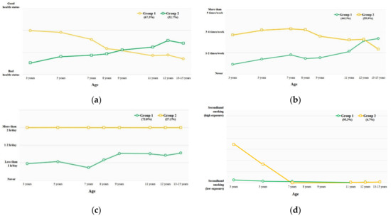 Trajectories of health-related behaviors from 3 to 15 years of age: (a, Subjective health status) 1: getting worse health status, 2: getting better health status; (b, Vigorous physical activity) 1: increasing physical activity group, 2: slight decreasing physical activity group; (c, Sedentary lifestyle) 1: low sedentary lifestyle group, 2: high sedentary lifestyle group; (d, Cotinine) 1: low level of cotinine as secondhand smoking in childhood group, 2: high level of cotinine as secondhand smoking in childhood.