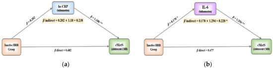 The effect of mediators (M) on the association between health-related behaviors group (X) and continuous metabolic syndrome score (Y): (a, hs-CRP) considering hs-CRP as mediators; (b, IL-6) considering IL-6 as mediators. * p < 0.05, ** p < 0.01. HRB, health-related behavior; hs-CRP, high-sensitivity C-reactive protein; IL-6, interleukin-6; cMetS, continuous metabolic syndrome score; CMH, Cardiometabolic health. All models were adjusted by sex, age, and monthly household income.