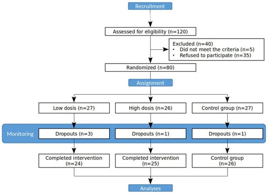 A total of 80 out of 120 subjects assessed for eligibility were randomised (see Figure 1 for a trial flow), from which 75 (93.75%) completed this study (36 men and 39 women, mean age 38.40 ± 13.54 years old). Five individuals did not match the criteria for inclusion in the trial, and thirty-five individuals refused to participate. Demography information is provided for each group in Table 1. The placebo group included a total of 26 participants with a mean age of 41 ± 14.36 years old (10 men and 16 women). The low-dose group showed an average age of 37.38% ± 12.29 years old (12 men and 12 women). The high-dose group had an average age of 36.36 ± 13.54 years old (14 men and 11 women). At the beginning of this study, the percentage of body fat in the control group was 27.75 ± 1.7%, while for experimental groups, it was 26.89 ± 1.7% (300 mg) and 24.39 ± 1.7% (500 mg). By the end, the control group registered a body fat percentage of 28.32 ± 1.7%, while the 300 mg and 500 mg consumption groups registered a body fat percentage of 25.98 ± 1.7% and 24.82 ± 1.7%, respectively. No significant differences were found. BMI (normal vs. overweight/obesity) did not show significant differences between groups, as well as between initial and final conditions after ending of this study.