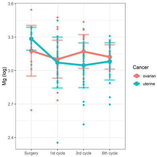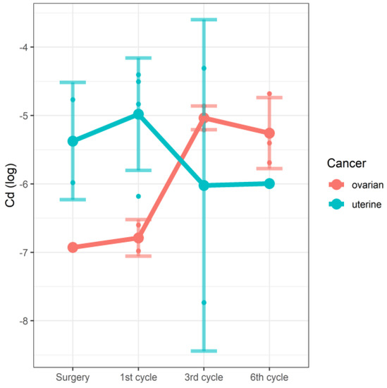 In the linear mixed model, we were able to demonstrate the effect of the interaction between the stage of therapy and the type of cancer on the concentrations of Mg (Figure 1) and Cd (Figure 2). In the case of both tested elements, the changes in concentrations observed along the study time points were significantly associated with cancer type. In the studied group of patients with cancer of the reproductive tract, serum magnesium (Mg) concentrations correlated with the cycle of chemotherapy and the type of cancer. However, due to the very limited number of raw data concerning Cd, these results should be treated with some caution. The details are shown in Table 4.