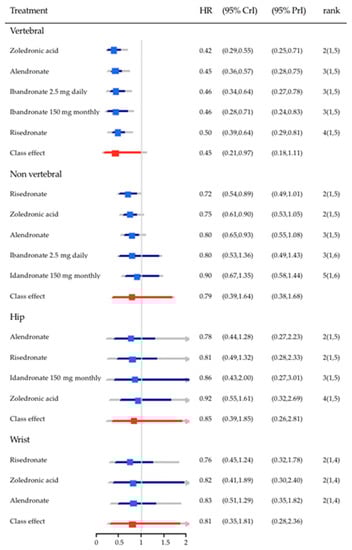 Hazard ratios (HR) and 95% credible intervals (CrI) for the effect of treatment relative to placebo by fracture outcomes. Blue—pooled effects; Red—class effects; Grey: 95% prediction intervals (PrI); median ranks and 95% CrI are displayed in the right hand column (as reprinted with permission from Ref. []. Copyright 2022, Elsevier).