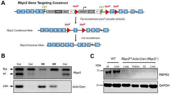 Disruption of the mouse Rbpr2 gene using the Cre/LoxP strategy and generation of the global Rbpr2 knockout (Rbpr2−/−) mice. (A) An Rbpr2 targeting vector was designed to replace exon 7 with a neomycin cassette (neoR) flanked by loxP sites. This resulted in the Rbpr2 neoR cassette allele. The neoR cassette was floxed out by mating Rbpr2fl/wt mice with the Rosaflp/flp mice. The Rbpr2fl/fl mice were then mated with Actin-Cre+ mice to finally generate littermate controls and the global Rbpr2 knockout (annotated as Rbpr2−/−) mice. (B) PCR-based genotyping for identifying the Rbpr2fl/fl; Actin-Cre+ (Rbpr2−/−) and littermate control mice. (C) A custom made RBPR2 antibody was generated and used to determine the systemic loss of RBPR2 protein expression in Rbpr2−/− mice. Immunoblot of protein extracts of tissues from adult WT and Rbpr2−/− mice. Pooled protein from n = 3 mice (per genotype) at 6–8 weeks of age. GAPDH antibody was used as the loading control. Int, intestine; WT, wild-type.