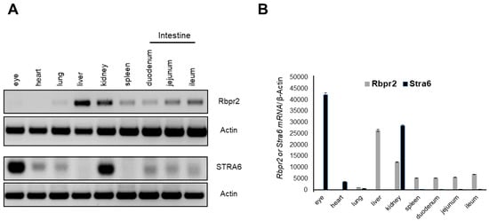 Total RNA isolation from WT mouse tissues (n = 3 mice) was carried out using TRIzol reagent (Invitrogen, Carlsbad, CA, USA) according to previously published methods [41,42]. Samples were pooled, and RNA concentration and purity were measured using a NanoDrop spectrophotometer (ND-100, ThermoScientific, Waltham, MA, USA). An Applied BioSystems reverse-transcription kit (Applied Biosystems, Waltham, MA, USA) was used to reverse transcribe 1.0 µg of RNA to cDNA. Semi-quantitative PCR was performed using gene-specific Rbpr2 and Stra6 primers. A β-Actin gene-specific primer pair was used as an endogenous control.
