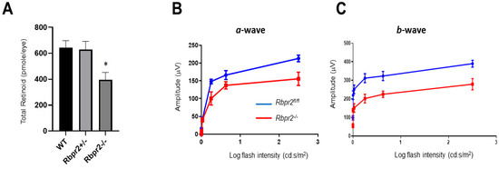 Rbpr2−/− mice on vitamin A-sufficient diets show decreased ocular retinoid concentration and loss of visual function. (A,B) Quantification of total retinoid concentrations (pmole/eye) in eyes from WT, Rbpr2+/−, and Rbpr2−/− mice (pooled eyes from n = 8 mice per genotype). * p < 0.05, Rbpr2−/− compared to controls. (C) Scotopic electroretinograms of 12-week old control (Rbpr2fl/fl) and Rbpr2−/− mice on vitamin A-sufficient (VAS) diets. * p < 0.05, for both a- and b-wave; Rbpr2−/− mice vs. controls.