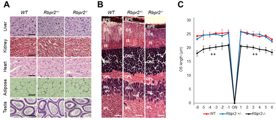 Rbpr2−/− mice on vitamin A-deficient diets show retinal phenotypes. (A,B) Representative tissue histology and staining of liver, heart, adipose, testis, retina (H&E stain), and kidney of 12-week old wild-type (WT), heterozygous Rbpr2+/−, and homozygous Rbpr2−/− (KO) mice on vitamin A-deficient diets. (C) Quantification of photoreceptor outer segment (OS) lengths from H&E sections of 12-week old WT, heterozygous Rbpr2+/−, and homozygous Rbpr2−/− (KO) mice using “spider graph” morphometry. The OS lengths from H&E sections through the optic nerve (ON; 0 μm distance from the optic nerve and starting point) were measured at 12 locations around the retina, six each in the superior and inferior hemispheres, each equally at approximately 150 μm distances. RPE, retinal pigmented epithelium; OS, outer segments; IS, inner segments; ONL, outer nuclear layer; INL, inner nuclear layer; IPL, inner plexiform layer. Scale bar = 50 µm (A); 100 µm (B). ** p < 0.005; Rbpr2−/− mice vs. controls.