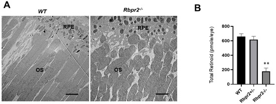 Interestingly, Rbpr2−/− mice on vitamin A-deficient diets showed photoreceptor anomalies, previously reported in Stra6−/− mice and in vitamin A-deficient retinas [7,12,17]. Histological analysis showed that Rbpr2−/− mice on VAD diets had significantly thinner photoreceptor OS cell layers (Figure 4B, OS lengths quantified in Figure 4C; ** p < 0.005). The TEM study confirmed that outer segments (OS) in Rbpr2−/− mice were ~36–54% shorter (p < 0.005) when compared to controls (Figure 5A). HPLC analysis further revealed an even more significant decrease in total retinoid concentration (~75–80% decrease; ** p < 0.005) in the eyes of Rbpr2−/− mice that were fed vitamin A-deficient diets compared to controls or Rbpr2−/− mice on vitamin A-sufficient diets (Figure 5B vs. Figure 3A; Figure S3D vs. Figure S3A).