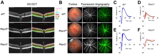 Rbpr2 is critical for photoreceptor cell viability and visual function under dietary vitamin A restriction. (A) OCT retinal analysis of 12-week old controls (WT, Rbpr2fl/fl) and homozygous Rbpr2−/− mice on vitamin A-deficient diets. Note that the photoreceptor cell layer is reduced (p < 0.05) in Rbpr2−/− mice compared to controls. (B) Fundus imaging of 12-week old wild-type (WT), floxed (Rbpr2fl/fl), and homozygous (Rbpr2−/−) mice after intraperitoneal injection with ICG (15 mg/kg, Acros Organics, NJ, USA). Note that blood vessel leakage was observed in Rbpr2−/− mice compared to controls. (C–F) Scotopic electroretinograms of 12-week old control (Rbpr2fl/fl) and Rbpr2−/− mice on vitamin A-deficient diets, Rbpr2−/− vs. controls at 0.1 cds/m2.
