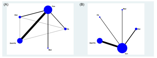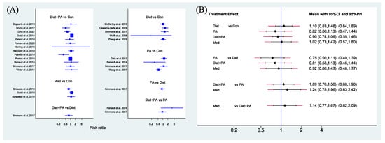 Network meta-analysis maps of the incidence of gestational diabetes mellitus (GDM) (A) and gestational weight gain (GWG) (B). Abbreviations: physical activity, PA; control, Con; medication, Med.